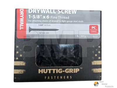 These Huttig-Grip Drywall Screws are designed for fast, secure, and professional drywall installation. Each screw measures 1-5/8" in length with a #6 coarse thread and Phillips bugle head, ensuring smooth countersinking without damaging drywall paper. Made from hardened steel and finished with a black phosphate coating, these screws offer reliable corrosion resistance and consistent drive performance for every project.