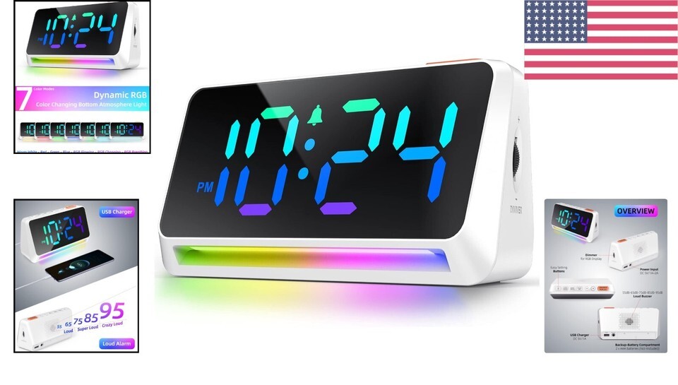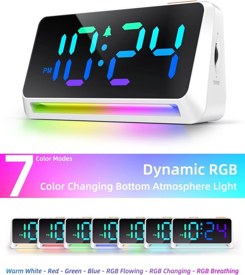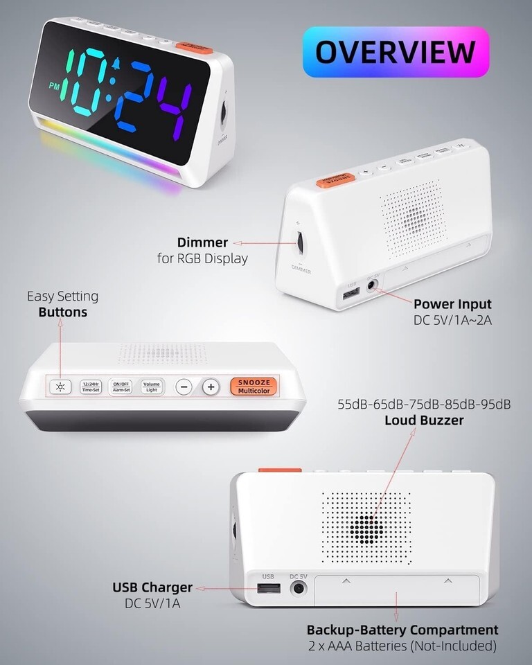 Features: 12-Hour Display,24-Hour Display,Alarm,Battery Backup,Night Light,USB Charger,6-Level Buzzer Volume,Adjustable Brightness,Snooze,Loud Alarm Clock,Adjustable Snooze Time,USB Charger Port,Dynamic RGB Display,Adjustable Night Light,12/24 Hour Time Format,Dimmable Display
