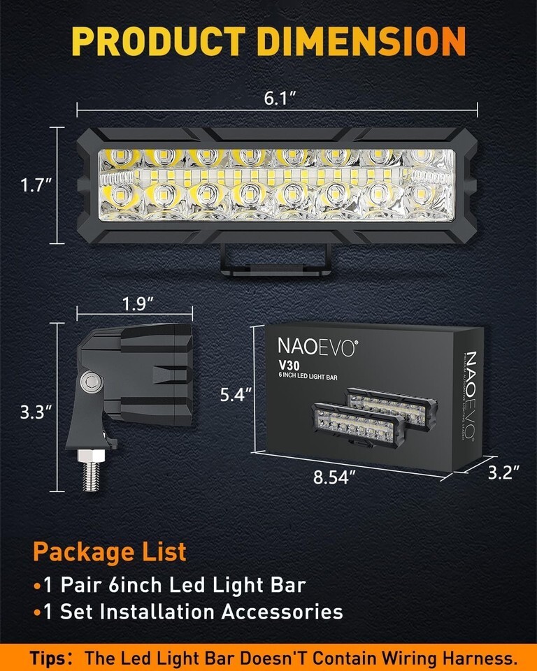 Items Included: 1 pair 6 inch led light bar,1 set paper manual,1 set installation accessories