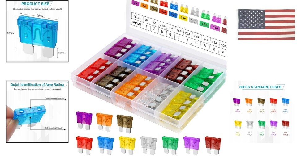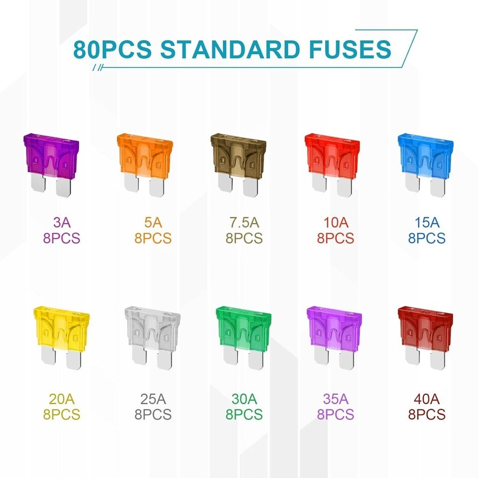 All Sizes You Need: This automotive fuse kit includes 80 pcs of commonly used standard fuses: 3A, 5A, 7.5A, 10A, 15A, 20A, 25A, 30A, 35A, 40A (8 pcs of each). Each fuse is color-coded and marked with its rated current for easy identification.