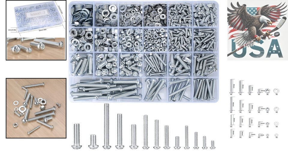 1080 Pcs Mechanical Screws Nuts Washers Assortment Kit M3-M6 Carbon Steel Har...