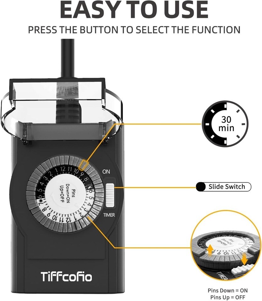Features: Heavy Duty,Daily Repeat Mechanical Timer,48 ON/OFF setting options,30 minutes interval,Easy to Use,Waterproof,Weatherproof performance,Vertical mounting recommended