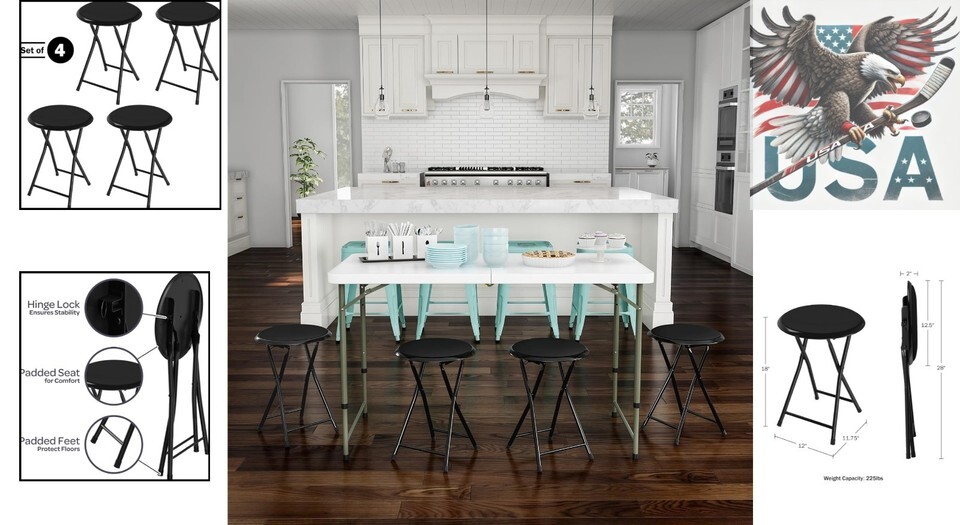 Black 4-Pack Folding Bar Stools Set - 18-Inch, Heavy-Duty, 225lb Capacity, Padded PVC Seats, Portable Indoor Use