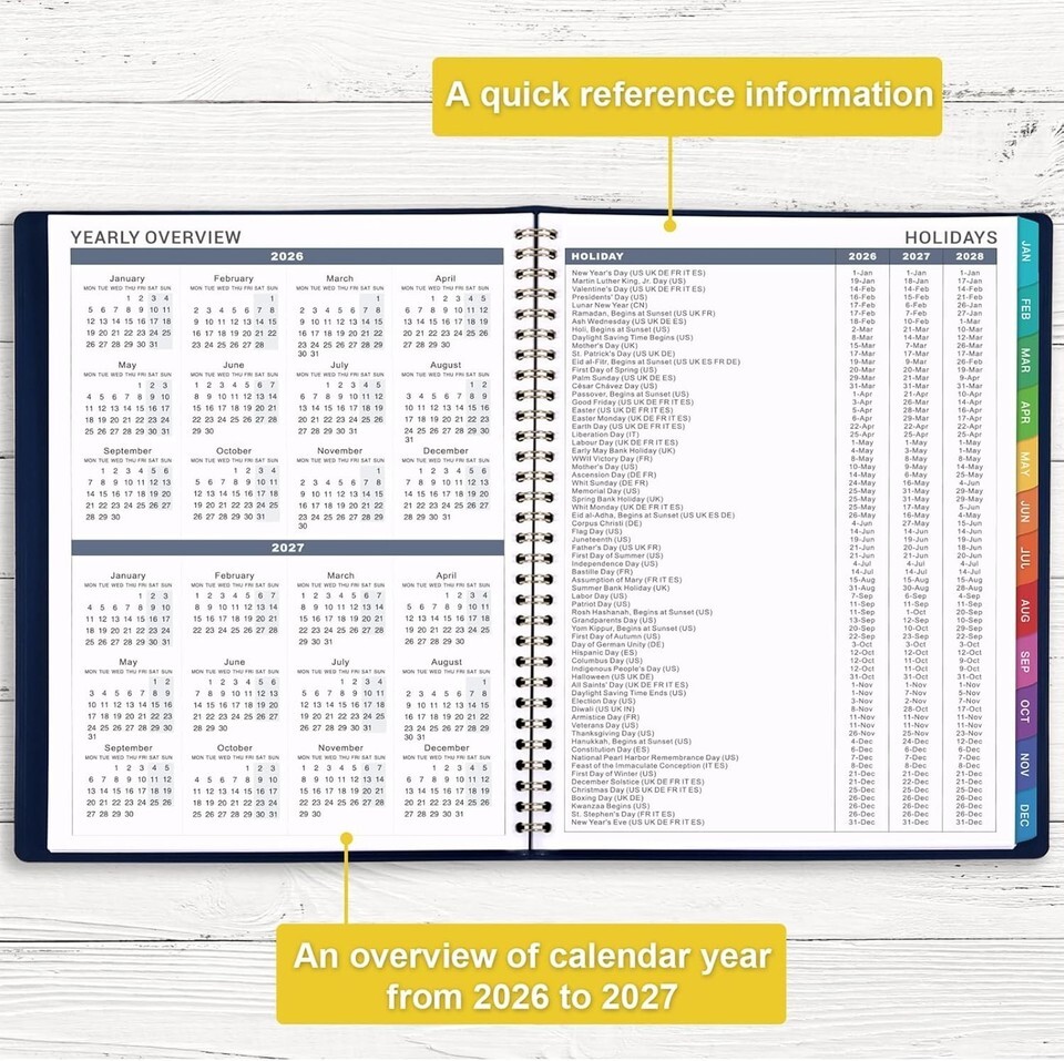 Includes a yearly overview for 2026-2027, major holidays for 2026-2028, and a quick reference page for all essential information.