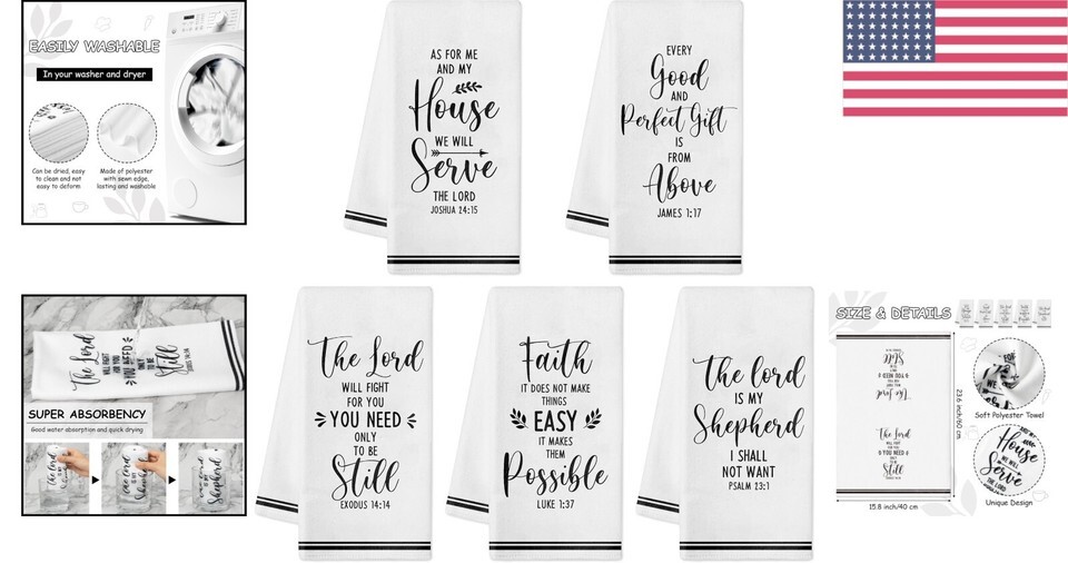 Looking to elevate your kitchen experience while celebrating your faith? Our 5-Pcs Absorbent Bible Verse Dish Towels offer the perfect combination of functionality and style. Crafted from durable materials, these towels are designed to handle life's daily spills while providing a touch of elegance to your kitchen decor. With their whimsical designs and efficient absorbency, they are not just tools ? they are cherished companions in your culinary journey.