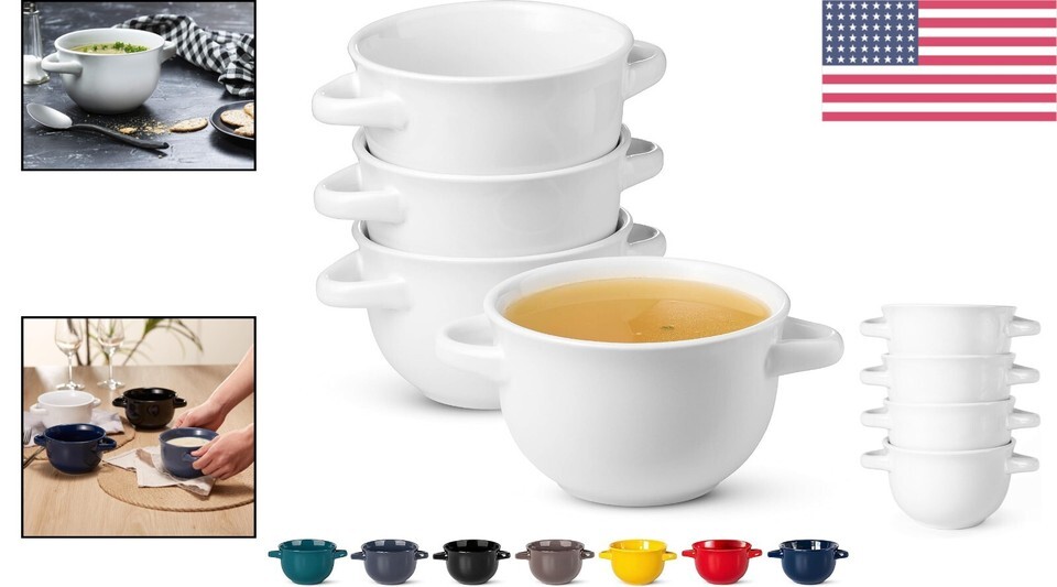 Modern White Soup Crocks with Comfort Grip - Set of 4, 18 oz Oven Safe Bowls