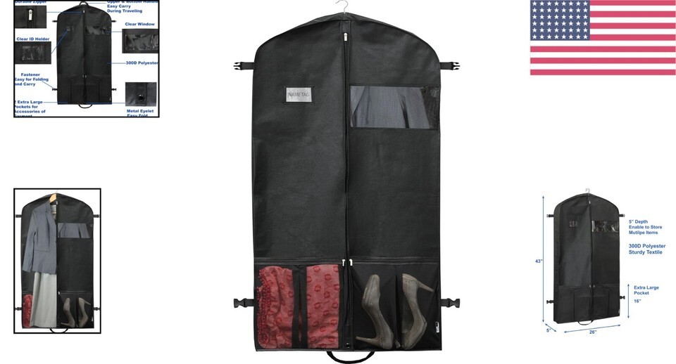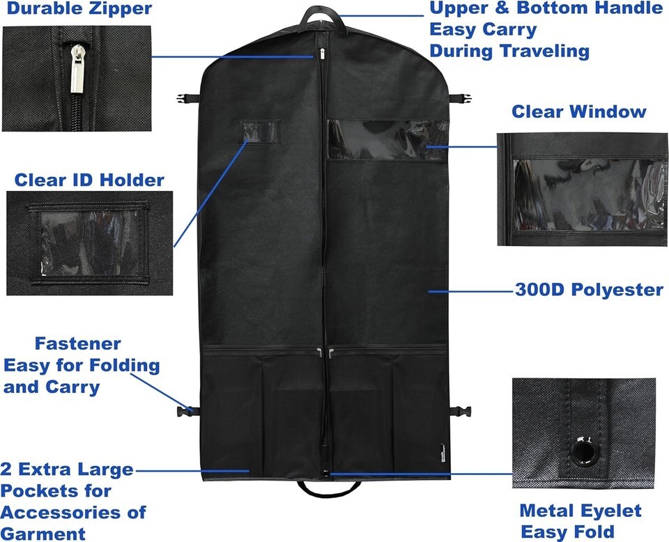 Features: Heavy Duty,Travel Friendly,Durable Material,Clear Window,ID Pocket,Extra Large Pockets,Breathable,Rip Resistant,Dust Free,Reusable,High Quality Zipper,Durable Material made from 300D polyester,ID Pocket for identification,Breathable material