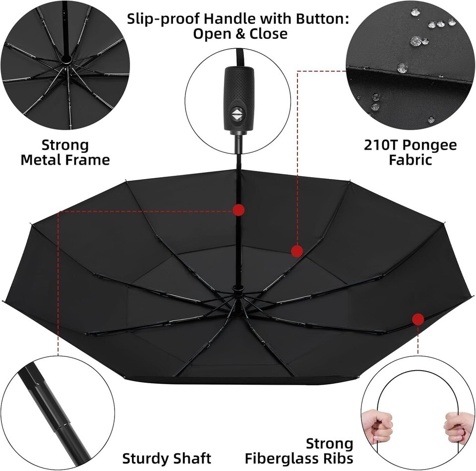 Windproof Design: Thanks to the double canopy vented design, this umbrella stands strong against fierce winds and rain.