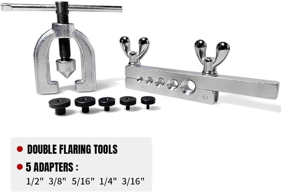 Comprehensive Package: Includes 1 flaring cone, 1 flaring bar (flaring yoke), 1 tube cutter, 5 adapters (sizes: 3/16", 1/4", 5/16", 3/8", and 1/2"), and a durable blow-molded case for seamless transportation and storage.