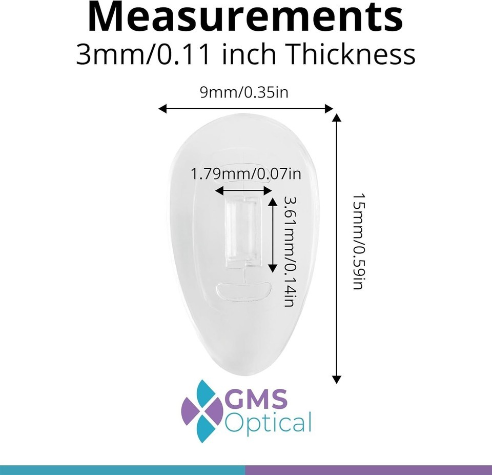 Measurements: 15mm tall x 6mm wide x 3mm thick. Perfectly sized as a medium option for most glasses.