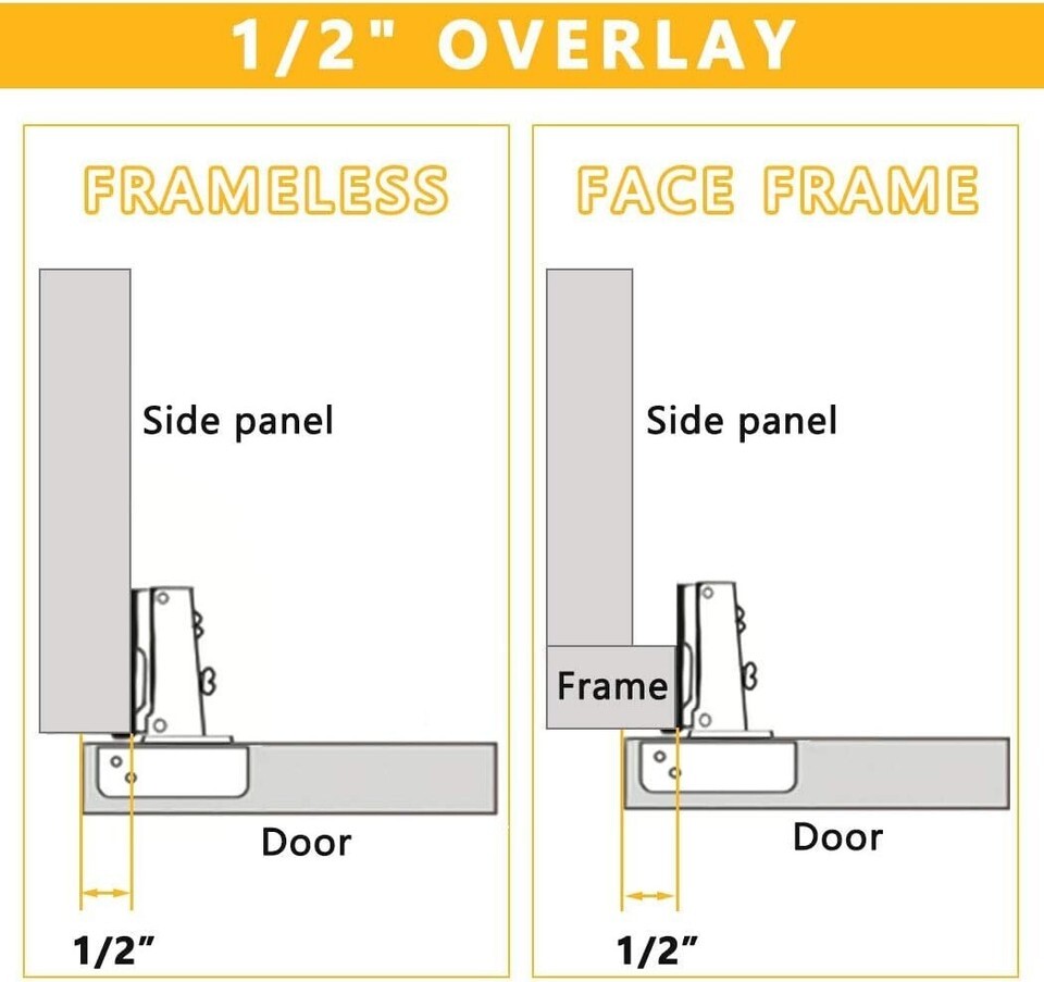 On FACE FRAME cabinets, note that the hinges will overlay 1/2" of the frame.