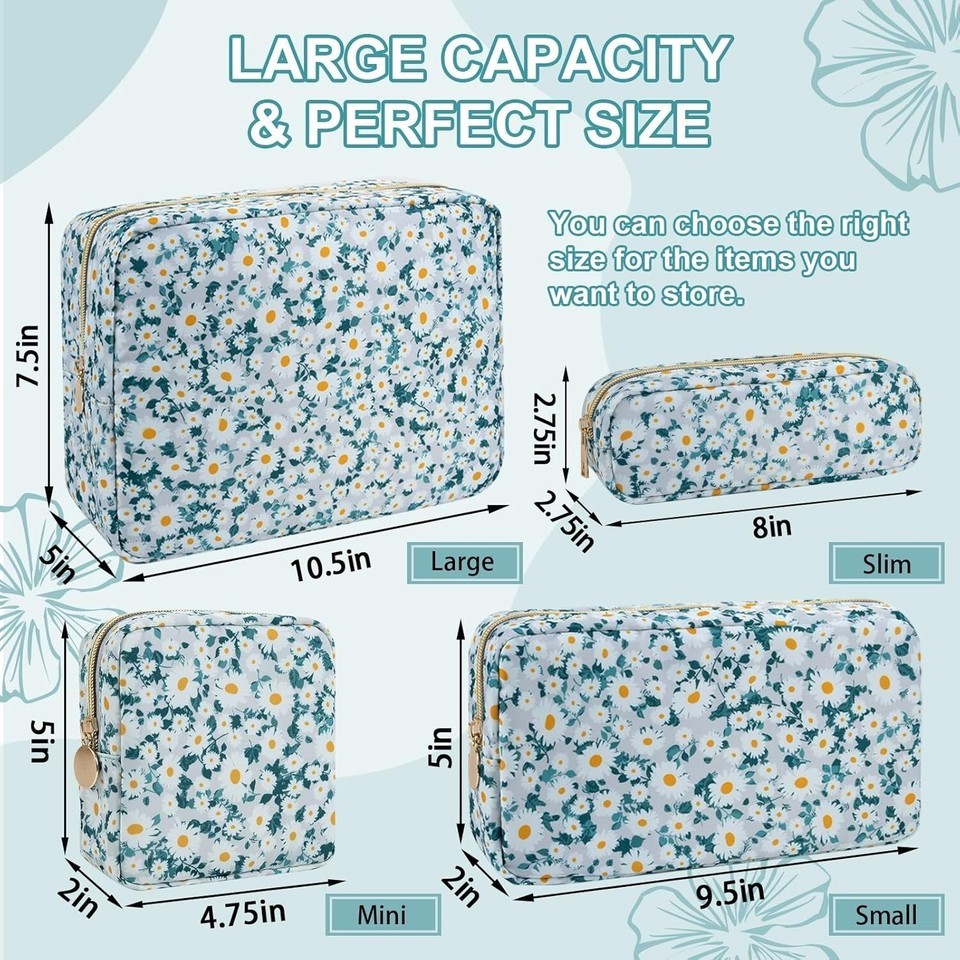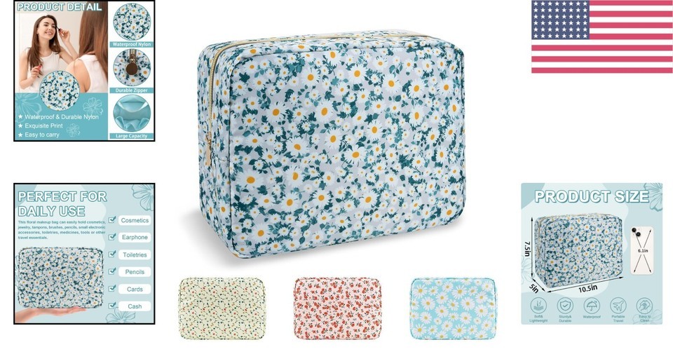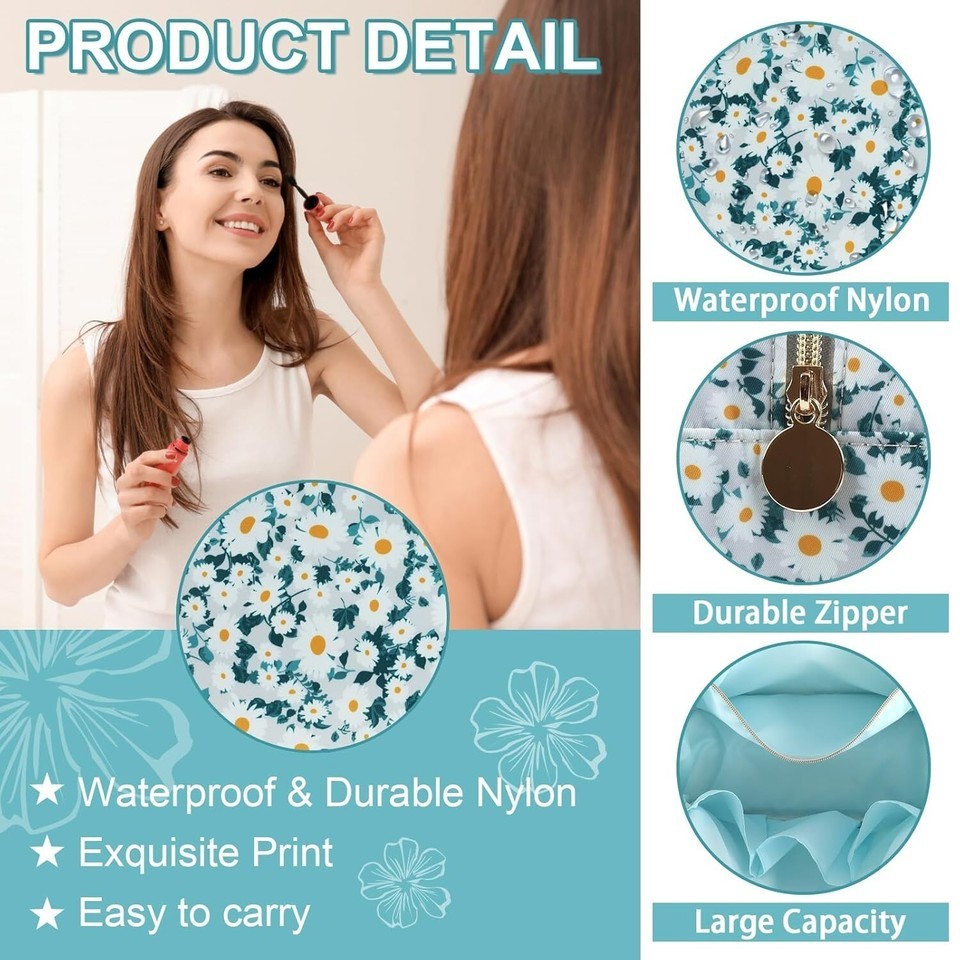 Waterproof Floral Makeup Bag - Large Green Daisy Organizer for Travel Essentials