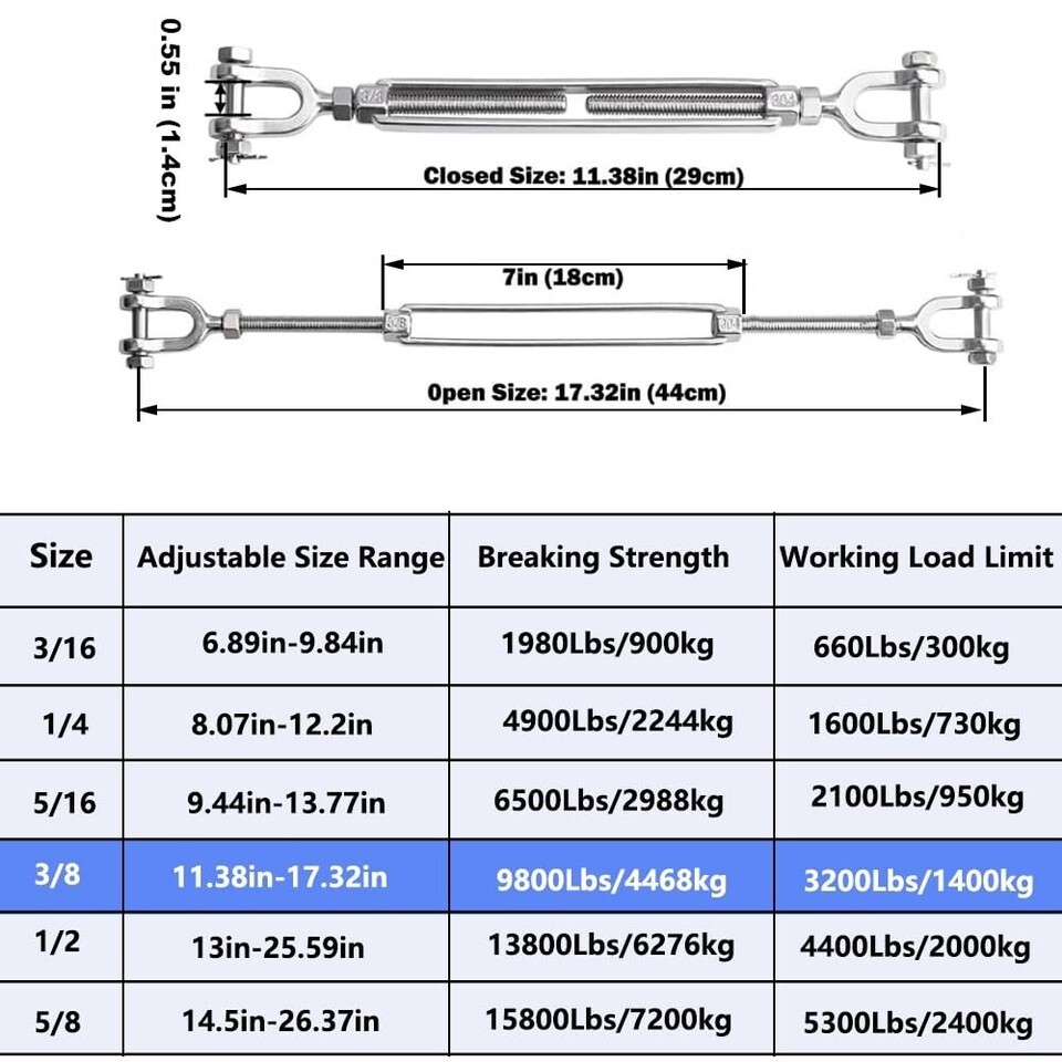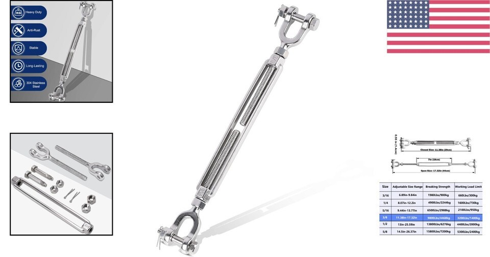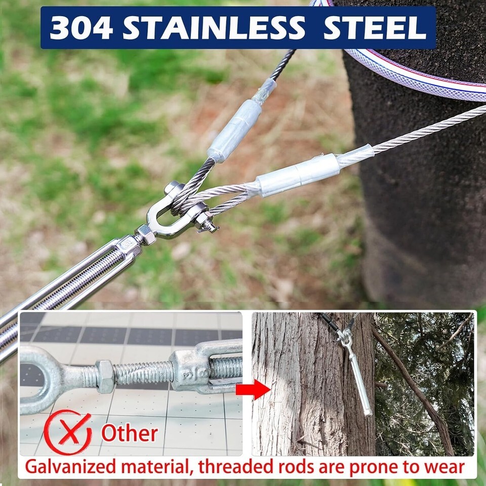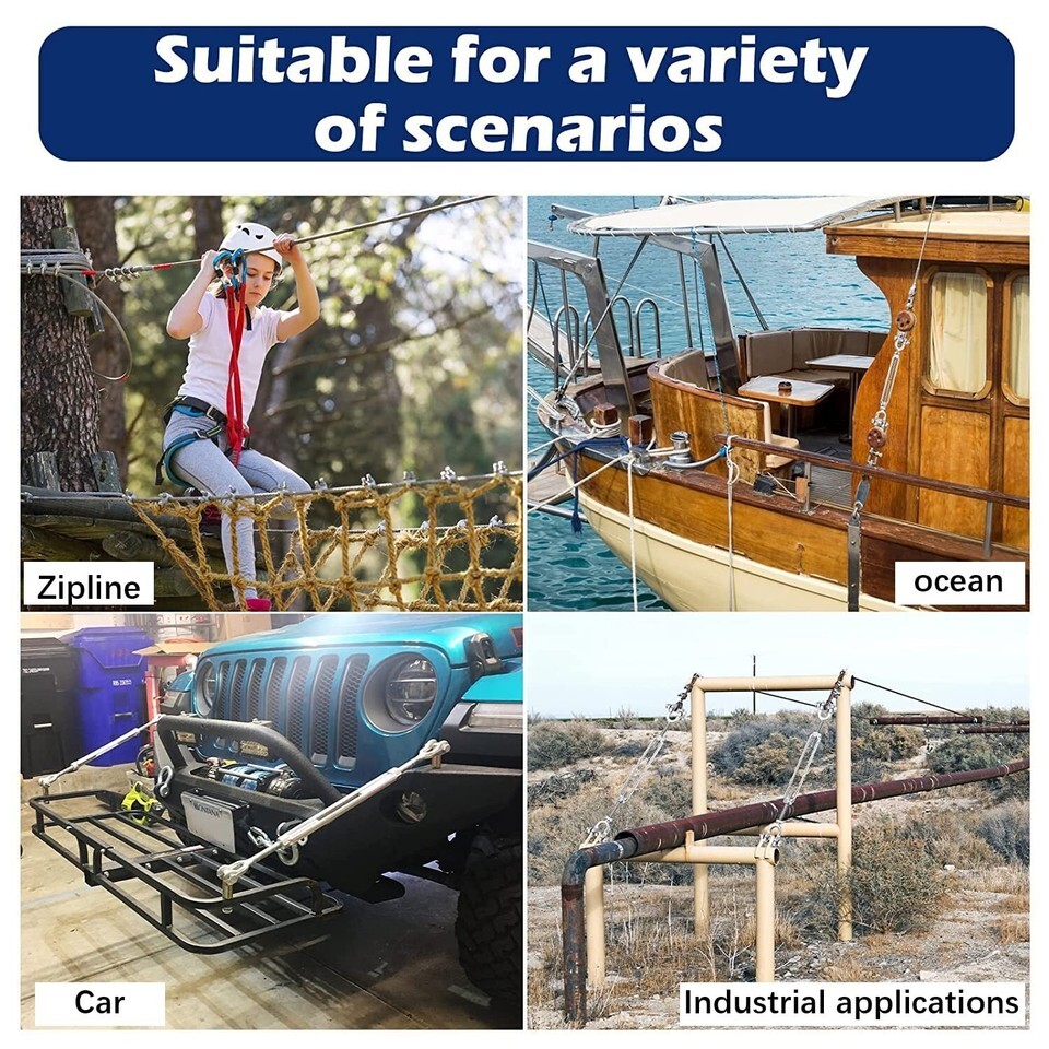 Wide Range of Uses: Perfect for tightening and tensioning ropes, ziplines, securing cables, aerial dog runs, ground anchors, clotheslines, shade sails, deck railings, and string lights.