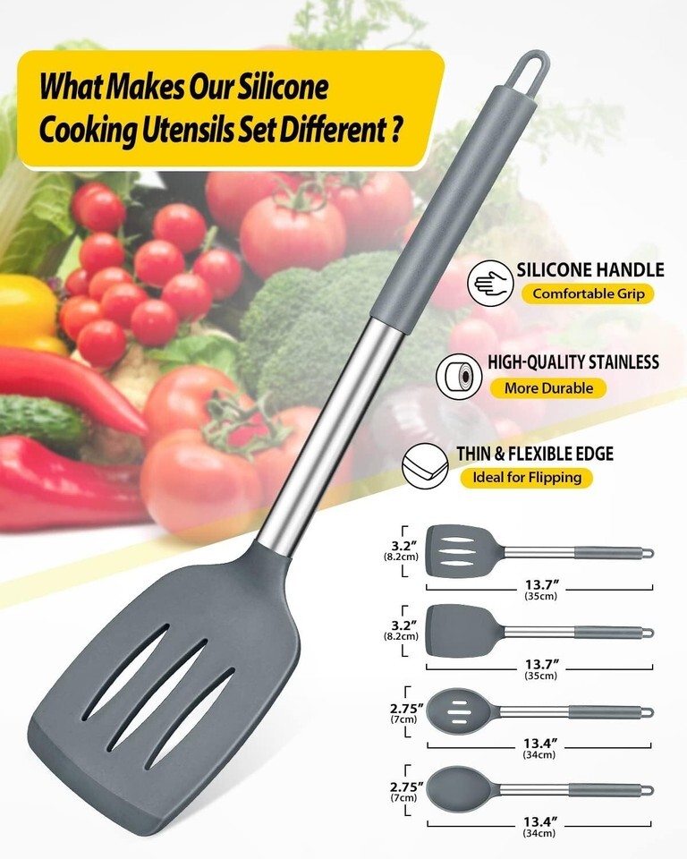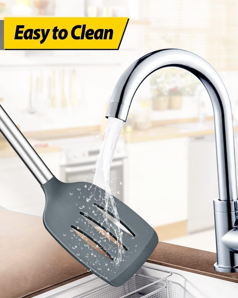 Versatile Use: The thin, flexible edge of the silicone turner is perfect for flipping, frying, and turning food effortlessly. The generously sized cooking spoon is ideal for serving larger portions, while the slotted spoon allows for quick draining of liquids.