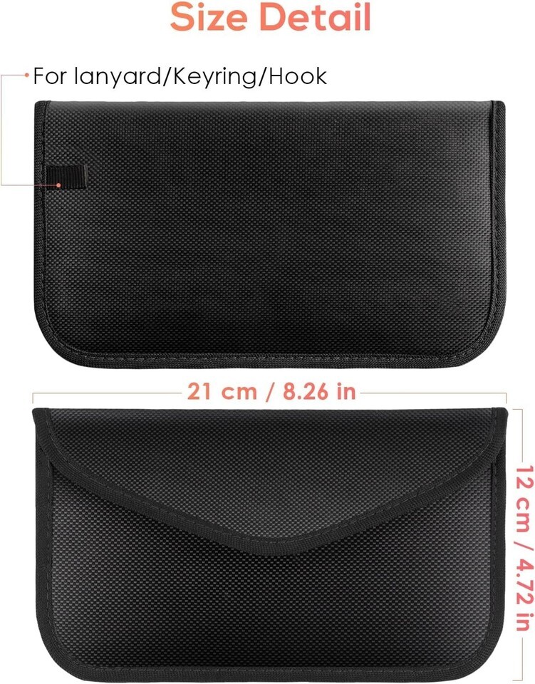 Convenient and Portable: An inner silver layer efficiently blocks signals while the outer waterproof cloth enhances durability for everyday use. Equipped with a holder for easy carrying and hanging.