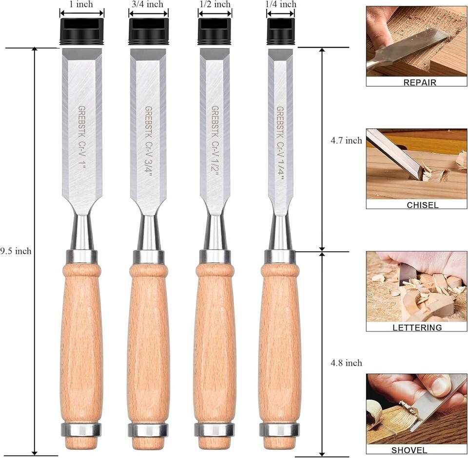Professional 9.5in Wood Chisel Set - 4 Chrome Vanadium Bevel-Edge Tools