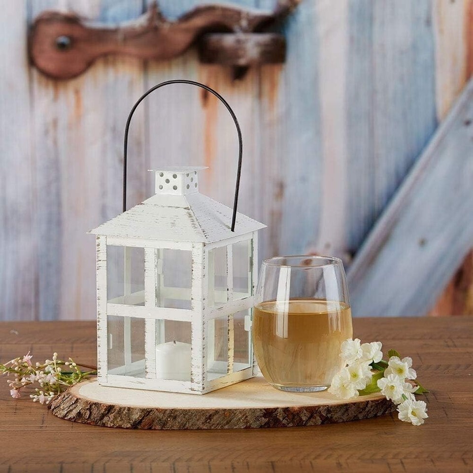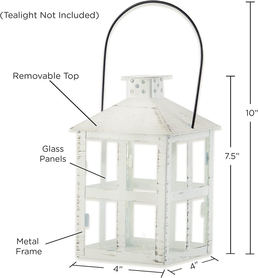 Vintage Inspired: Rustic farmhouse charm with white metal finish and distressed details; features glass windows and a metal wire swing handle.