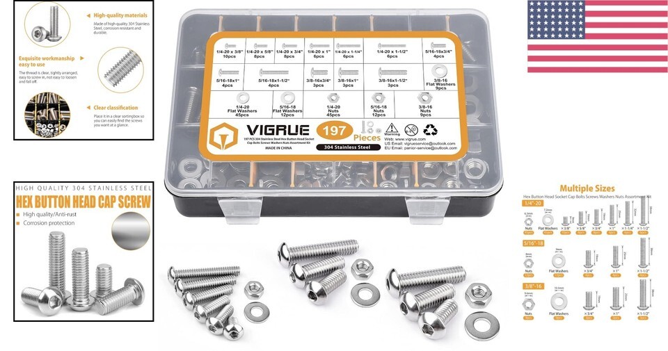 Elevate your toolbox with our 197-Piece 304 Stainless Steel Hex Cap Screw Set?a must-have for anyone seeking quality and reliability in their hardware. This professional-grade kit caters to a wide range of needs, from regular repairs to specialized projects. Experience superior rust and oxidation resistance, ensuring your projects withstand the test of time.