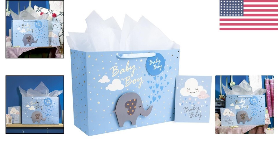 BABY BOY DESIGN: Celebrate in style with our delightful baby blue elephant design, featuring charming 3D details to bring smiles to every face. Complete with a blue ribbon handle, a coordinated birthday card, and a whimsical round gift tag.