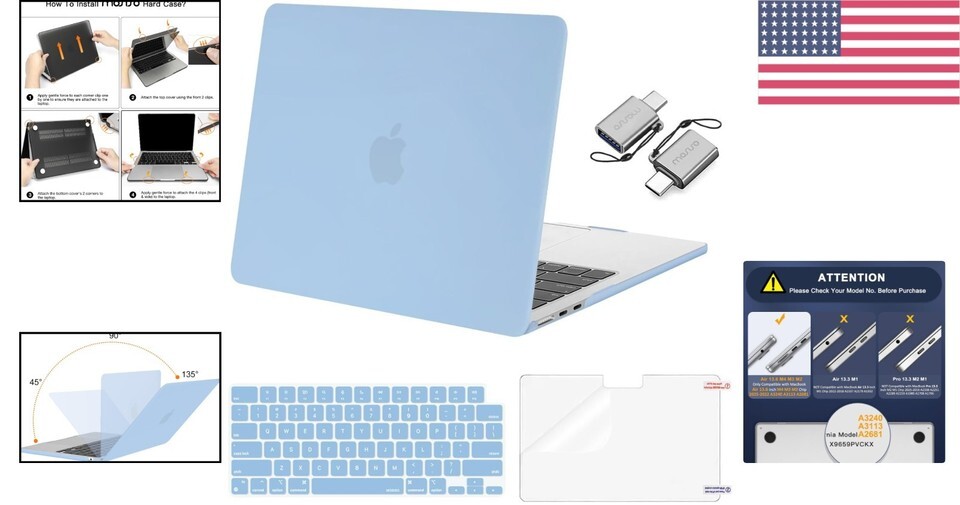Protect your valuable MacBook Air with a case that combines functionality and sophisticated style. This set not only secures your laptop from daily wear and tear but also enhances the usage experience with included accessories. Please ensure compatibility by checking your MacBook?s model number before purchasing, making sure it matches the models A3240, A3113, or A2681.