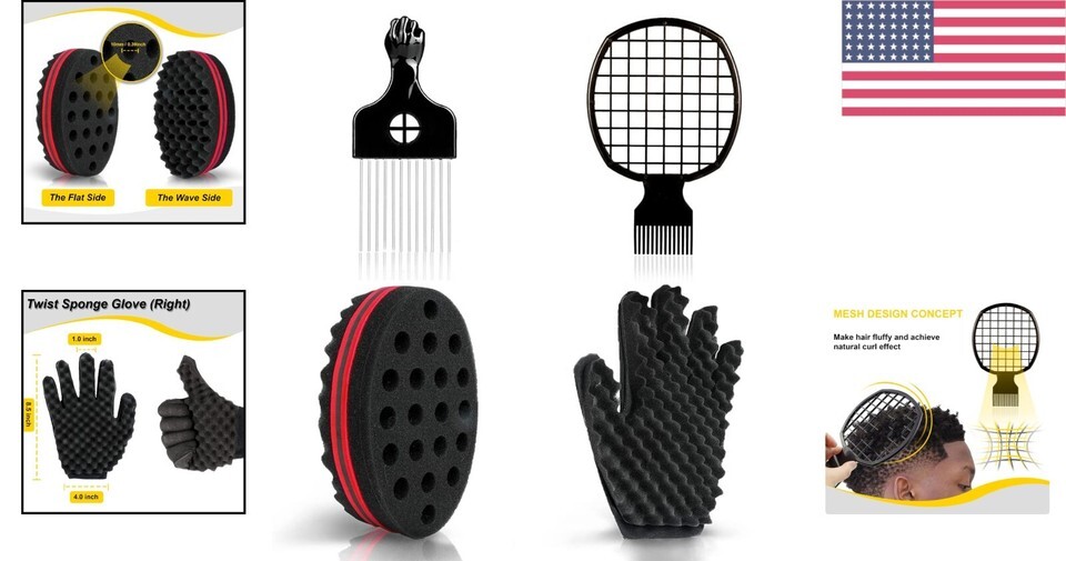 Includes a two-sided hair sponge, curl sponge glove (right), a hair pick, and a hair twist comb.