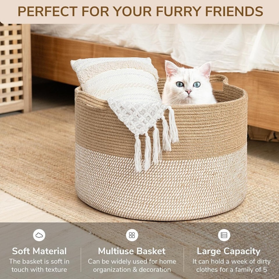 Stylish 90L Cotton Jute Storage Basket with Handles for Home Organization