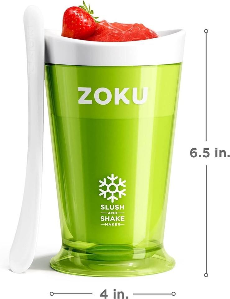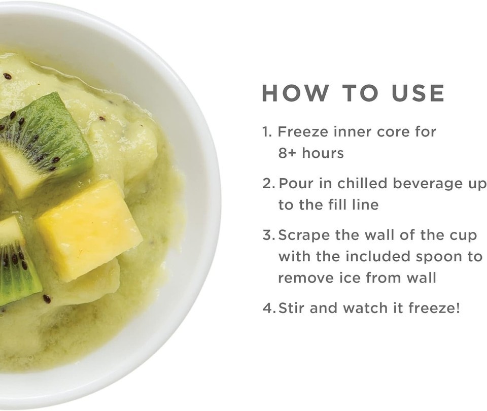 **EASY TO USE**: Simply freeze the inner core for 8+ hours, insert it into the outer cup, pour in your ingredients, mix and scrape with the included spoon, and witness your slush freeze before your eyes.