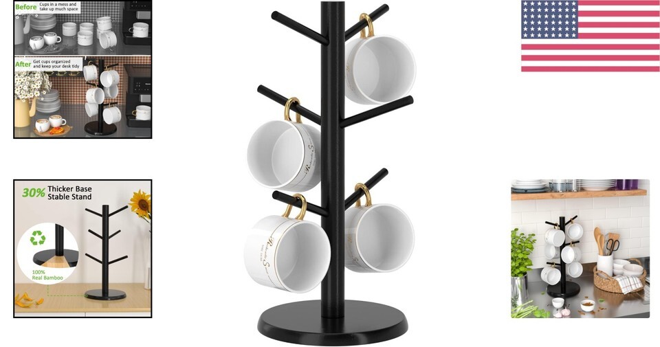 Sturdy Black Bamboo Coffee Cup Organizer - 6-Hook Design for Stylish Spaces