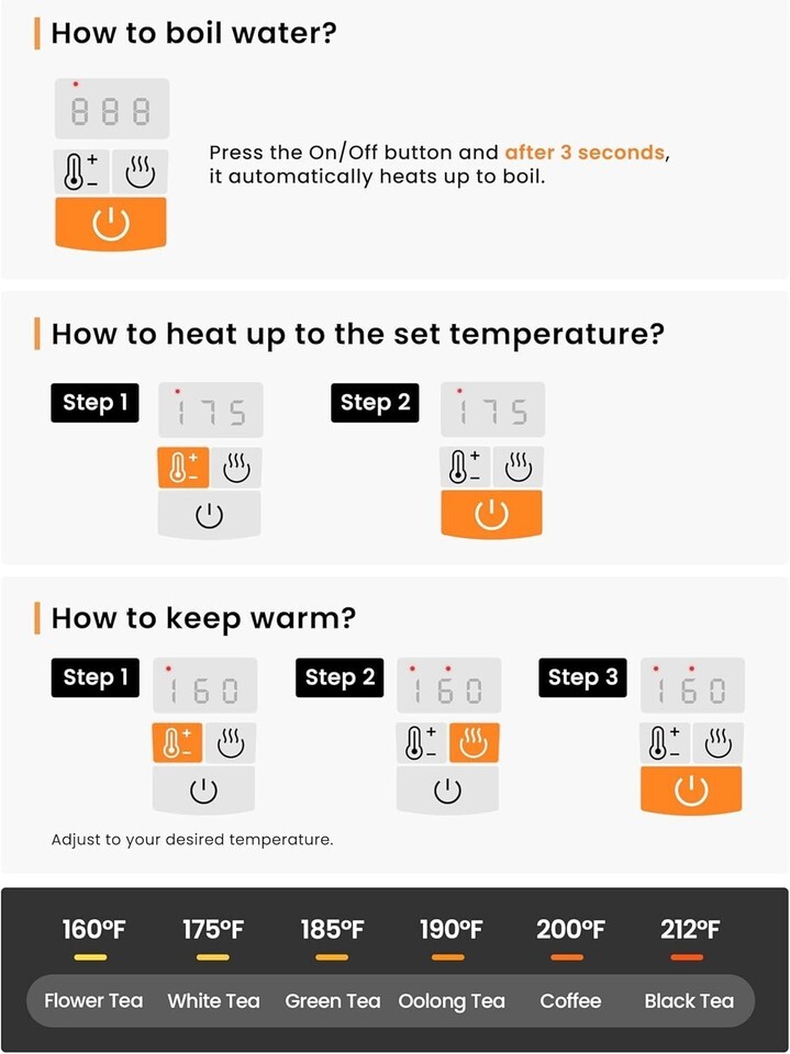 Advanced Features: The kettle features LED lights and an advanced thermostat ensuring precise water temperature control within 5F, allowing you to enjoy your drinks at their optimal temperature.