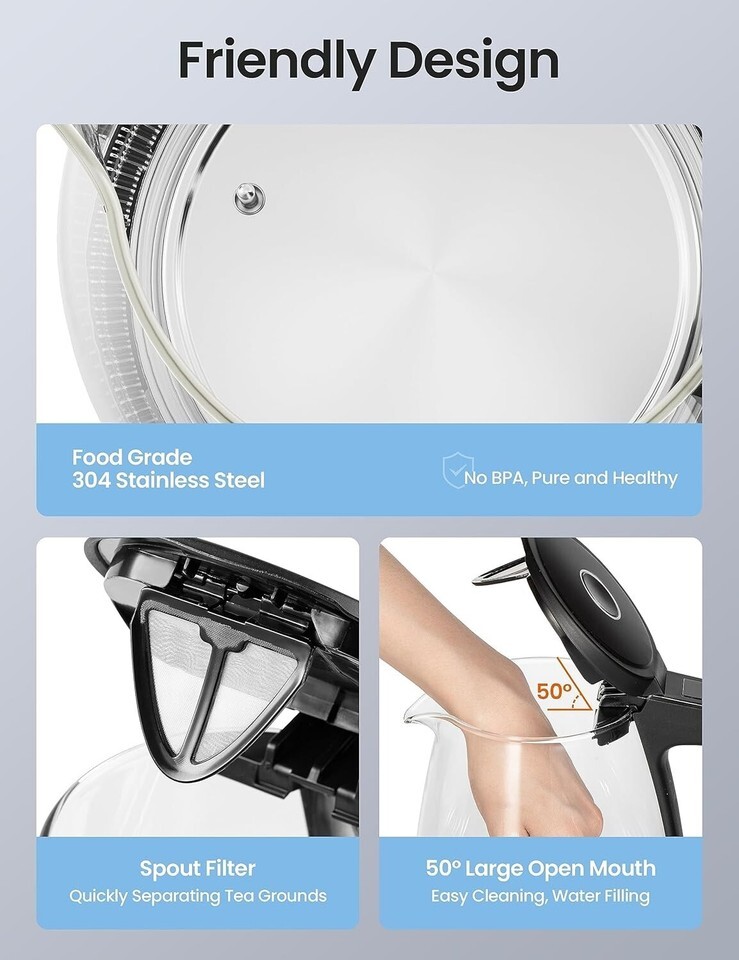 User-Friendly: The wide mouth and non-removable 50 lid make filling and cleaning your kettle effortless. Its measuring scale helps you boil just the right amount of water, catering perfectly to your needs.