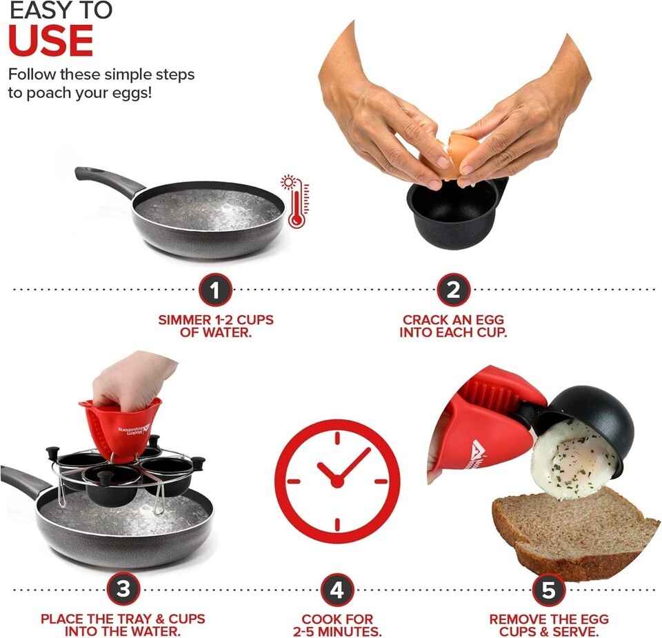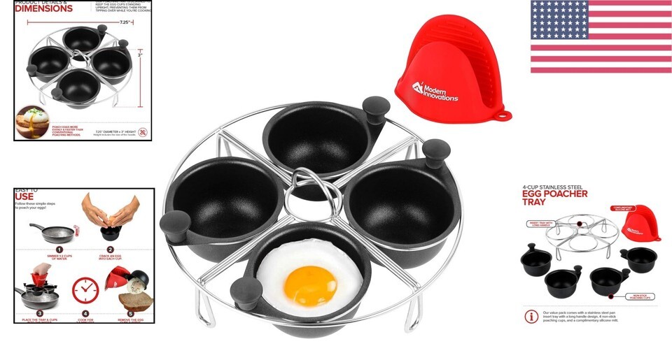 Complete Set: Comes with a stainless steel pan insert tray, 4 non-stick poaching cups with a quick cool knob, and a complimentary silicone mitt for easy handling.