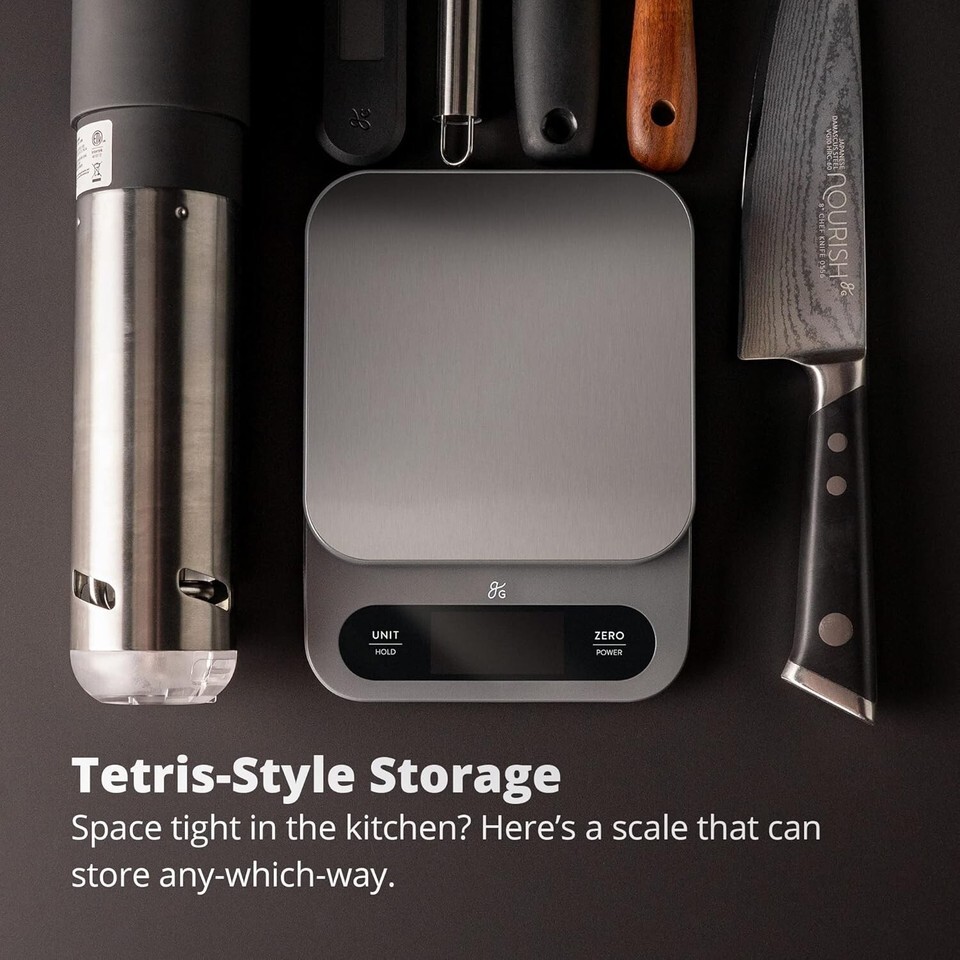 Say goodbye to clunky kitchen accessories that clash with your decor. Our sleek, modern design fits seamlessly into any kitchen setting. The hi-def VA LCD display and vibrant chrome accents of the stainless steel weighing platform complement even the trendiest spaces, ensuring your counter looks pristine while measuring ingredients.