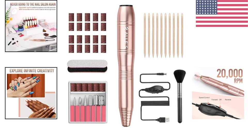 Comes complete with 6 interchangeable nail drill bits, 26 sanding bands, a nail art brush, multifunctional dual-ended nail sticks, and 100/180 nail files.