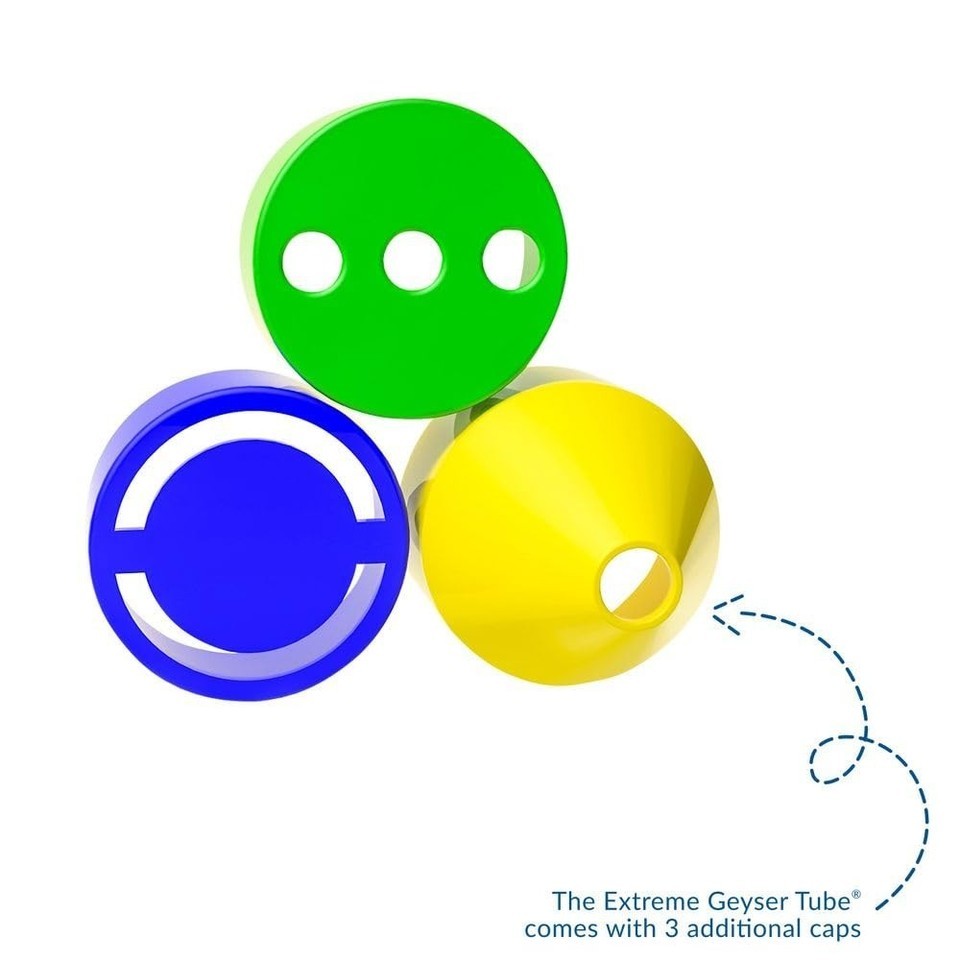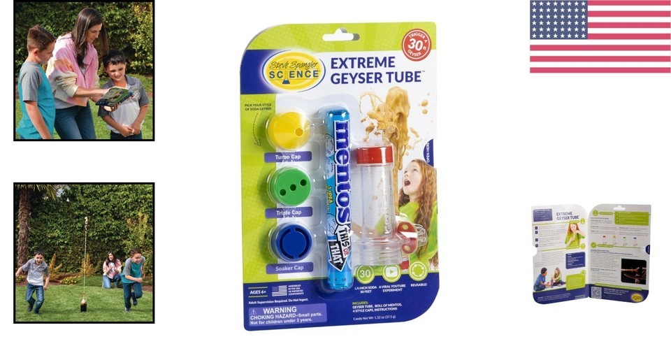 Includes a uniquely crafted geyser tube, Mentos candies, and 3 cap variations for experimenting: