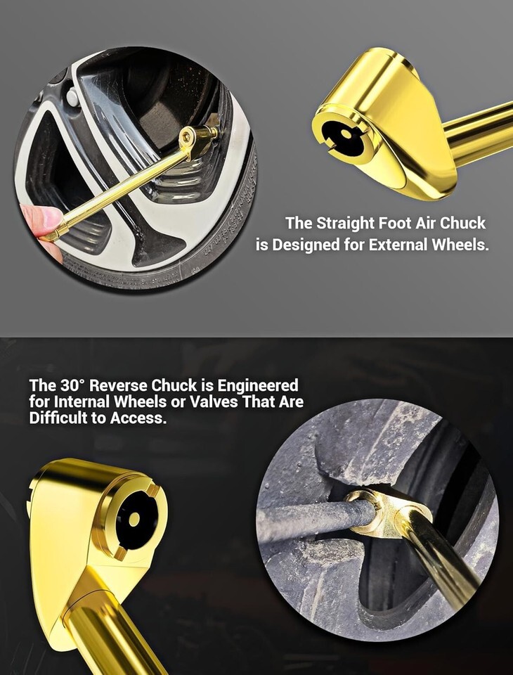 Both air chucks feature closed flow technology, allowing air to flow only when engaged with tire valve cores.
