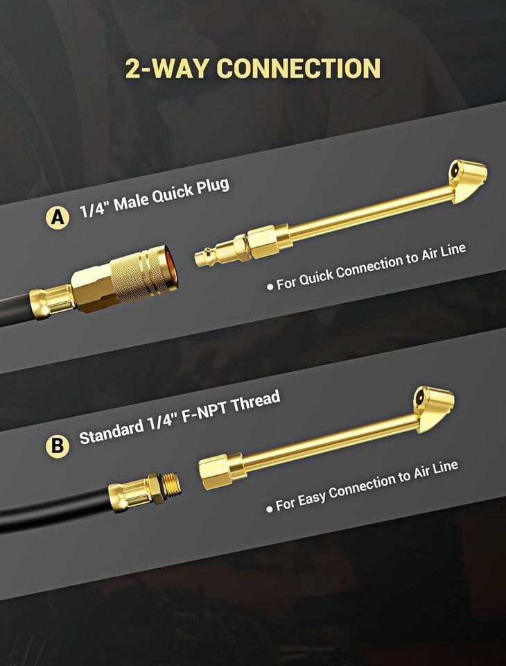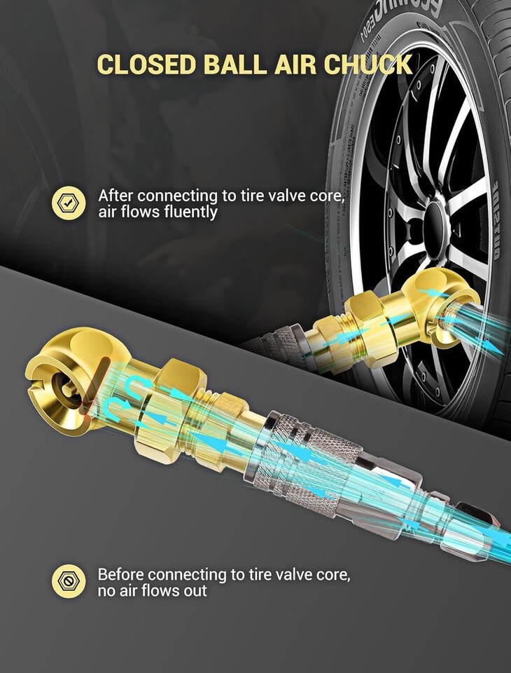 Wide applicability for inflating Schrader valves of bikes, motorcycles, cars, trucks, and more.