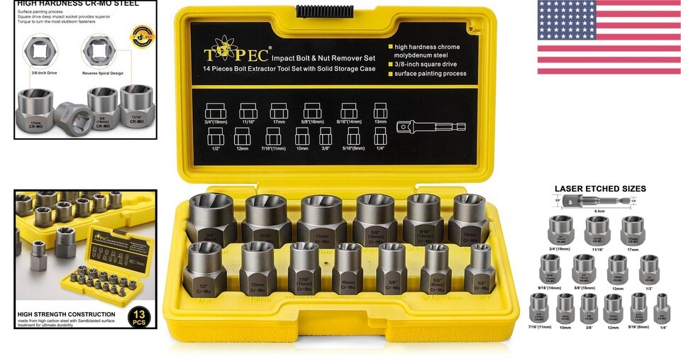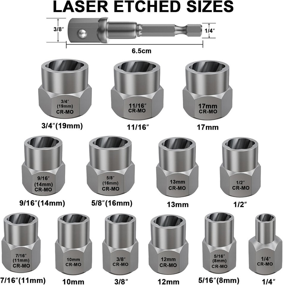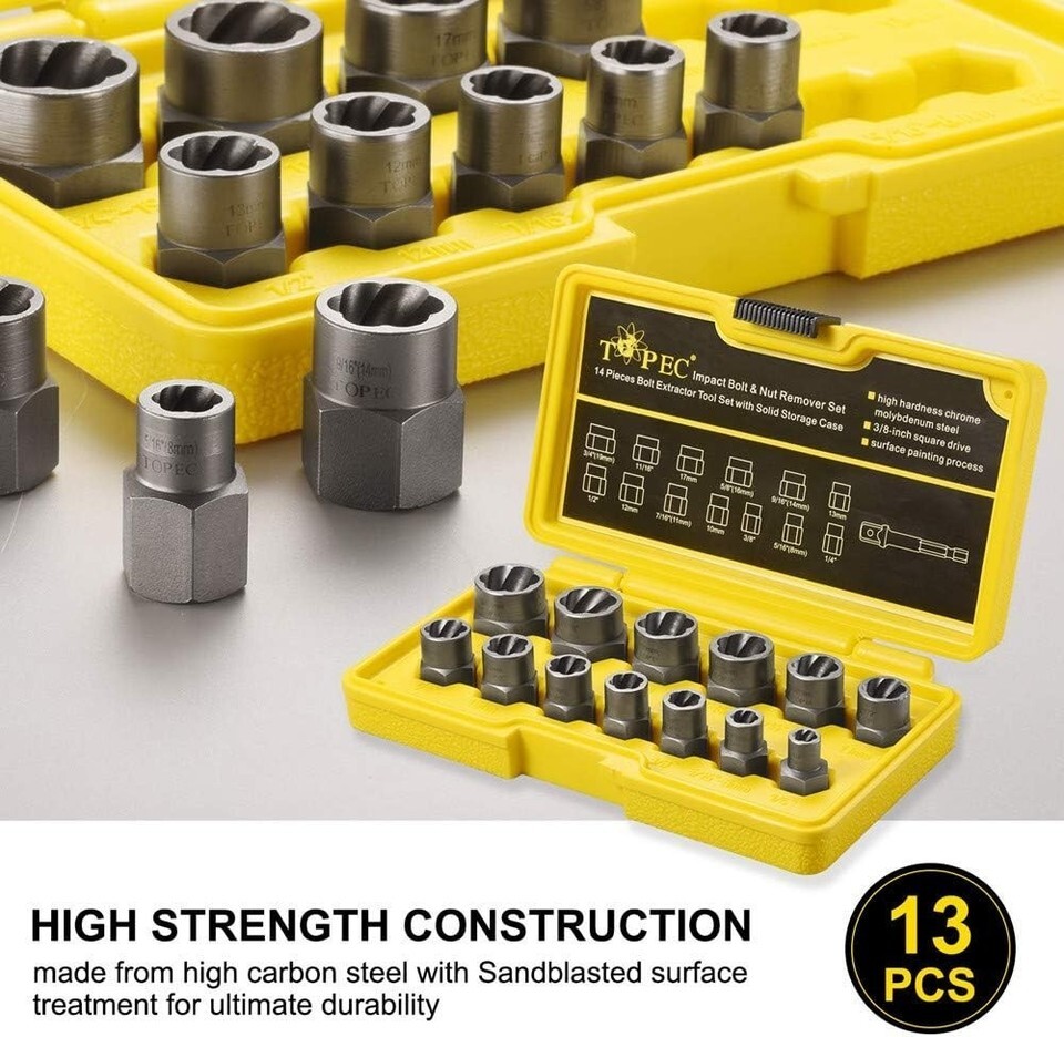 The Professional 13+1 Chrome Molybdenum Bolt Extractor is the ultimate solution for anyone frustrated by damaged bolts or nuts. With its cutting-edge design that guarantees a secure grip and its comprehensive size range tailored to fit multiple applications, each use will exceed your expectations. Coupled with a rust-resistant surface and top-notch customer support, tranquility and efficiency in your projects are just a purchase away.
