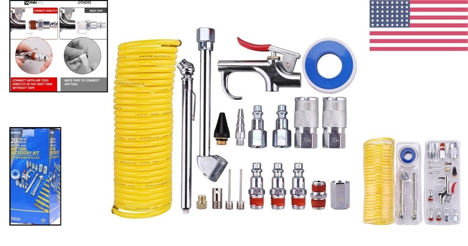 Versatile Air Compressor Kit: 25ft Coil Hose, Tire Gauge More - 20 Pieces