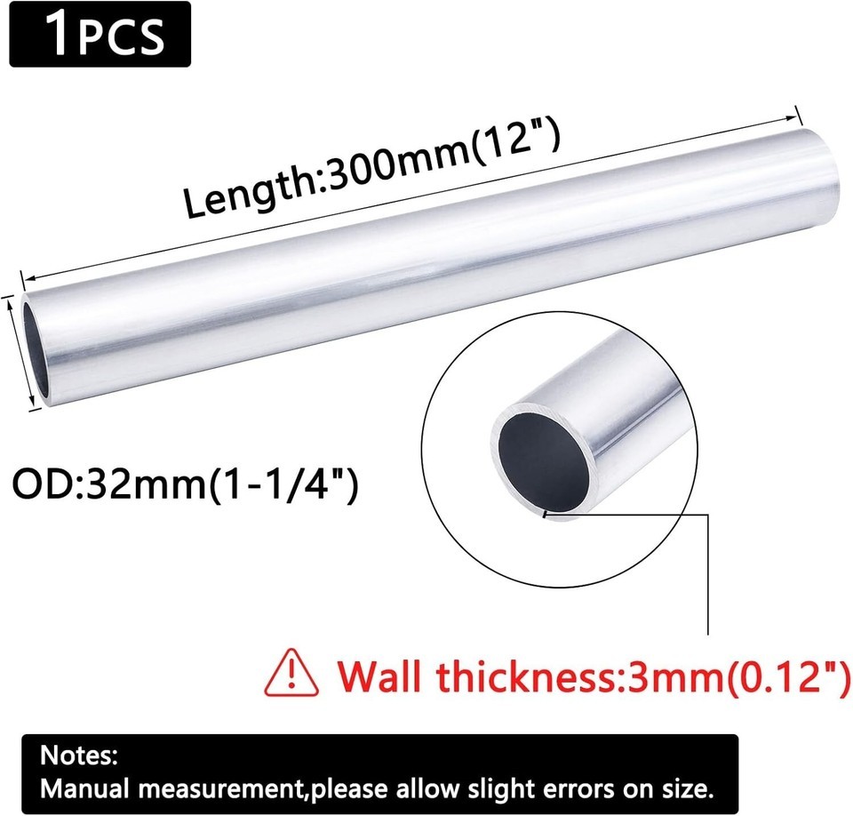 Size: OD: 32mm (1-1/4"), ID: 26mm (1"), Wall Thickness: 3mm (0.12"), Length: 12" (300mm)