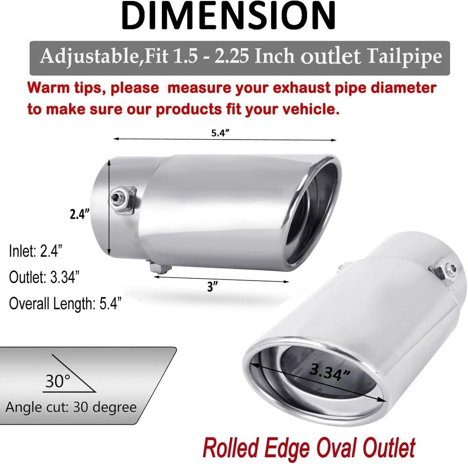 Crafted with an elegant oval outlet and chrome-plated finish, these exhaust tips bring sophistication while remaining exceptionally durable. Effortlessly upgrade your ride in a matter of minutes ? no heavy equipment or mechanical skills required! Achieve that polished, refined look you have always desired.