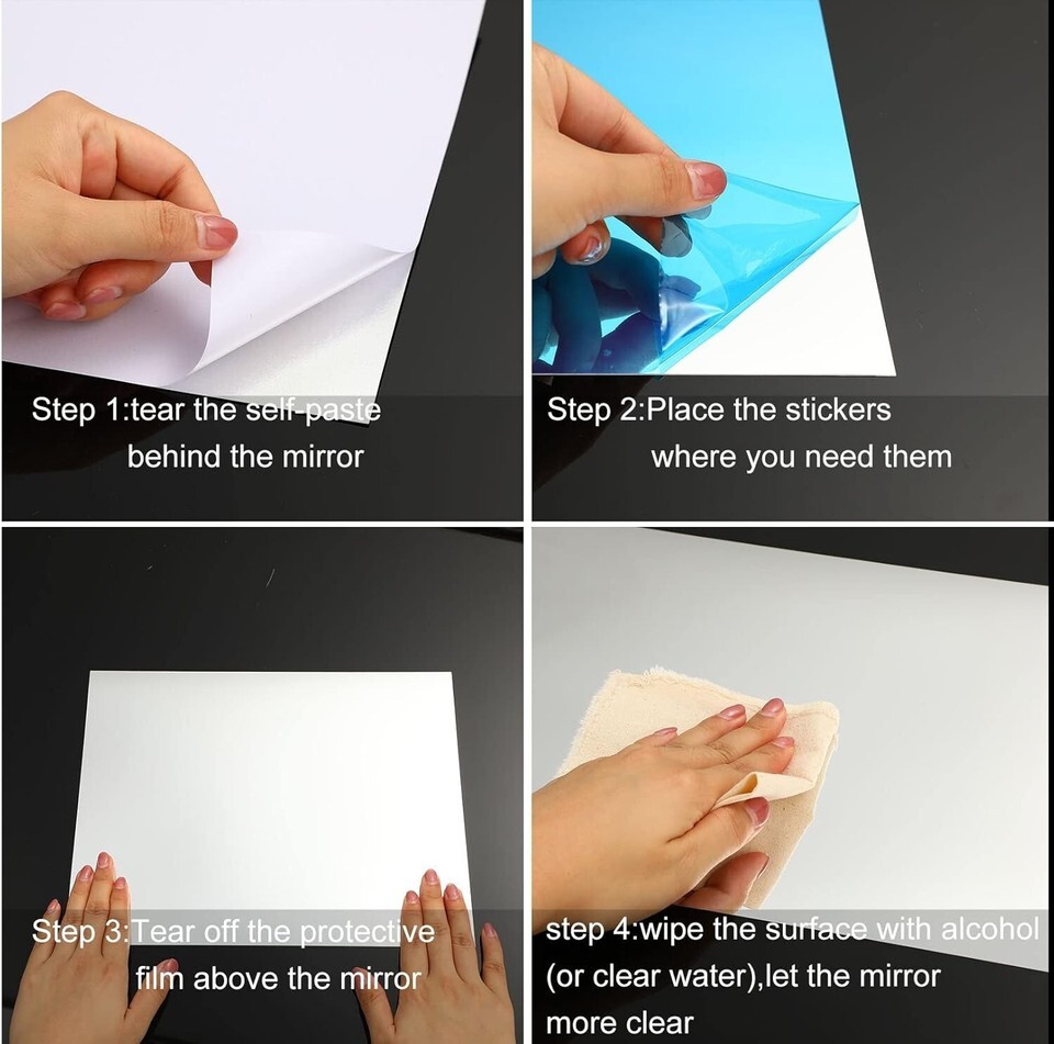 **Easy to Use**: Each tile is designed with a protective blue film that safeguards the mirror during transport. Simply strip the film before application for immediate use.