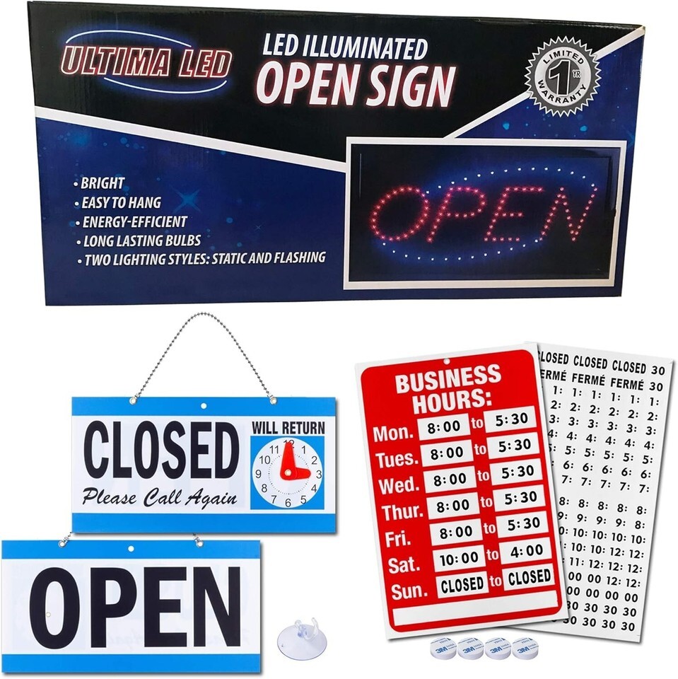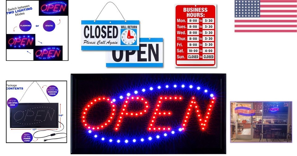 Features: Includes Business Hours Sign,Includes Open Closed Sign,Includes Hanging Chain,Easy to Install,Static and Flashing Modes,Long Lasting,Reliable