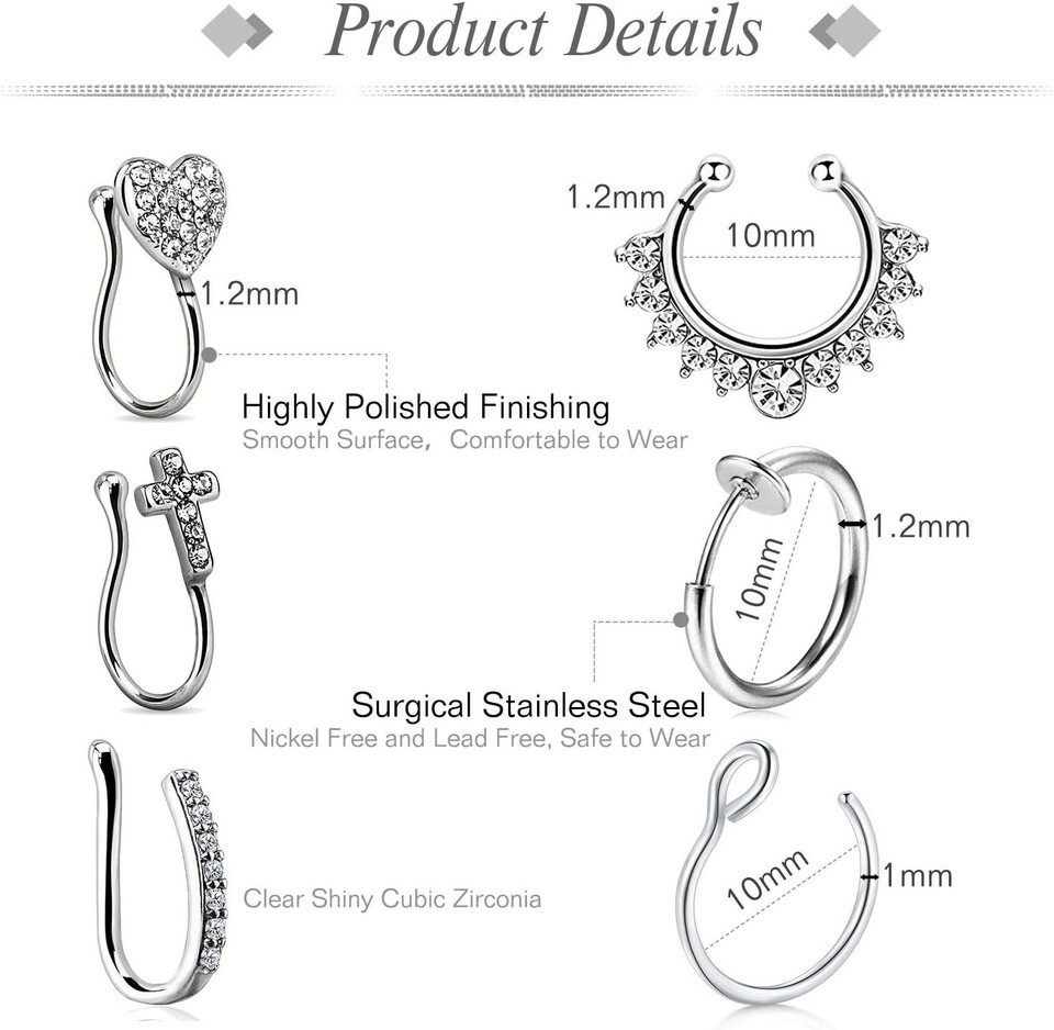 Experience the perfect blend of fashion and comfort with our Versatile Faux Nose Ring Collection. This exquisite set of six rings offers an array of stunning designs, allowing you to express your individuality without the commitment of a permanent piercing. Each ring is carefully crafted from hypoallergenic 316L stainless steel, ensuring a safe and long-lasting wear for all. Whether you're dressing up for a night out or adding flair to your daily wardrobe, this collection provides endless possibilities.