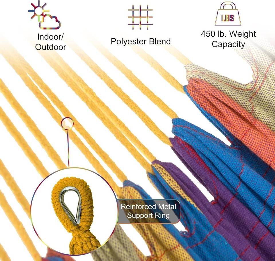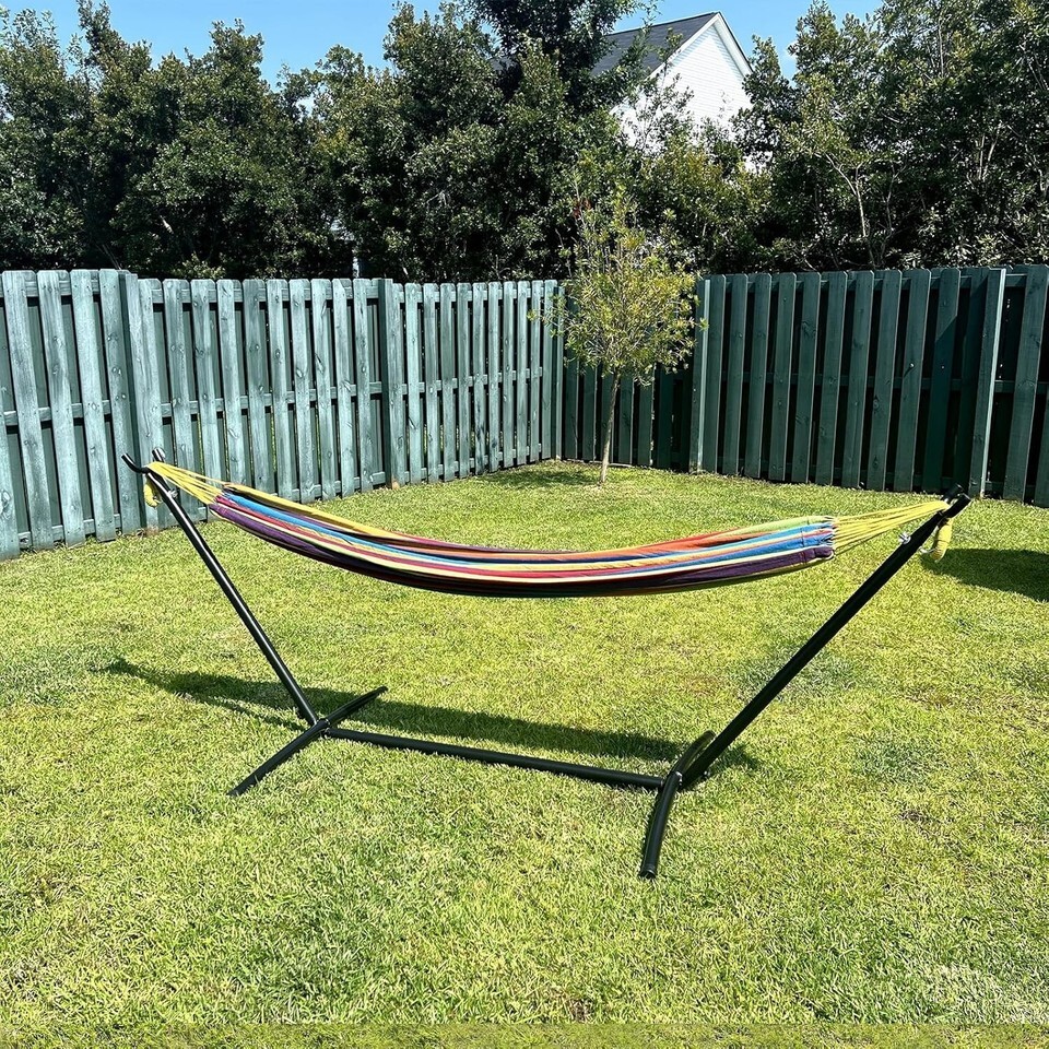 The striking combination of contrasting color stripes against a robust black steel stand makes this hammock a captivating centerpiece for any yard. As you recline, you'll feel as if you?re gently swaying on a tranquil lake, transporting you to a serene escape.