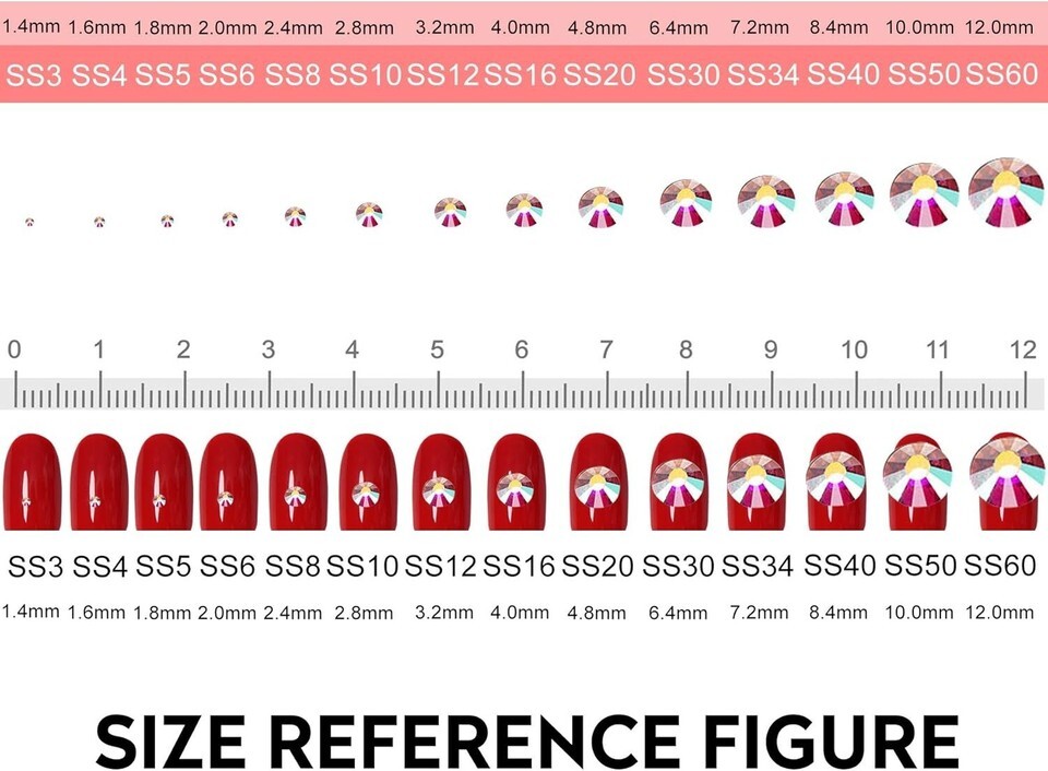 To achieve the perfect look for your nail art, please refer to the size chart provided. These smaller sizes are ideal for nails; however, if you're considering embellishments for clothing or shoes, you may want to explore larger options available in the rhinestones collection.