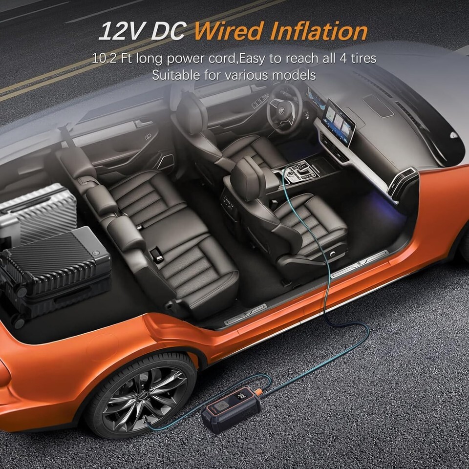 Fast and Efficient Inflation: Rapidly inflates a standard car tire (like 195/65 R15) to 29-35psi in approximately one minute.
