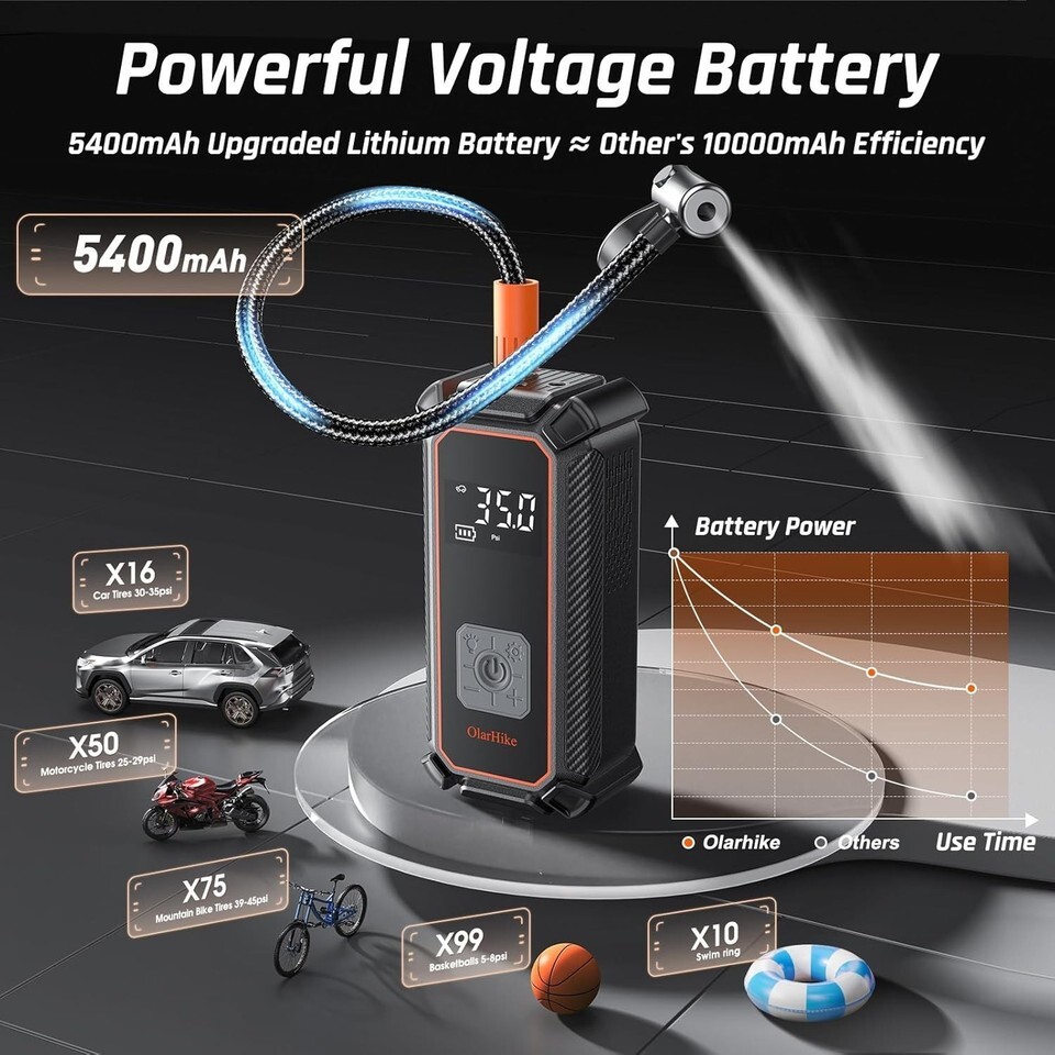 Robust Voltage Battery: Inflate up to 12 tires on a single charge with easy dual mode operation: use the embedded battery or connect via the 12v outlet power cord.