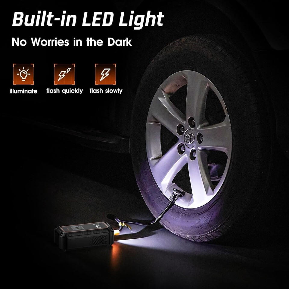 LED Emergency Light: Provides visibility during tire inflation in low-light conditions.