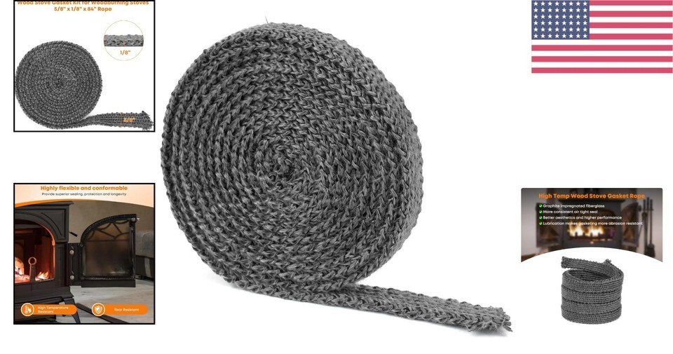 Graphite Impregnated Fiberglass Gasket Rope for Wood Stoves - 5/8" x 1/8" x 84"