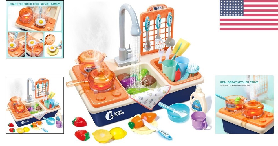 Features: With running Water,Interactive,Light and Sound Effects,Electric Faucet,Water Flow,Realistic Cooking Sounds,Removable Draining Rack,Role Play,Skill Development,Imaginative Play,Simulation Kitchen Utensils,Tableware Accessories,Washing and Cooking Activities